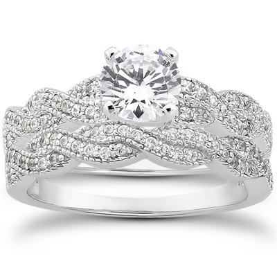 Pave Diamond Matching Engagement Wedding Ring Set Vintage Milgrain.